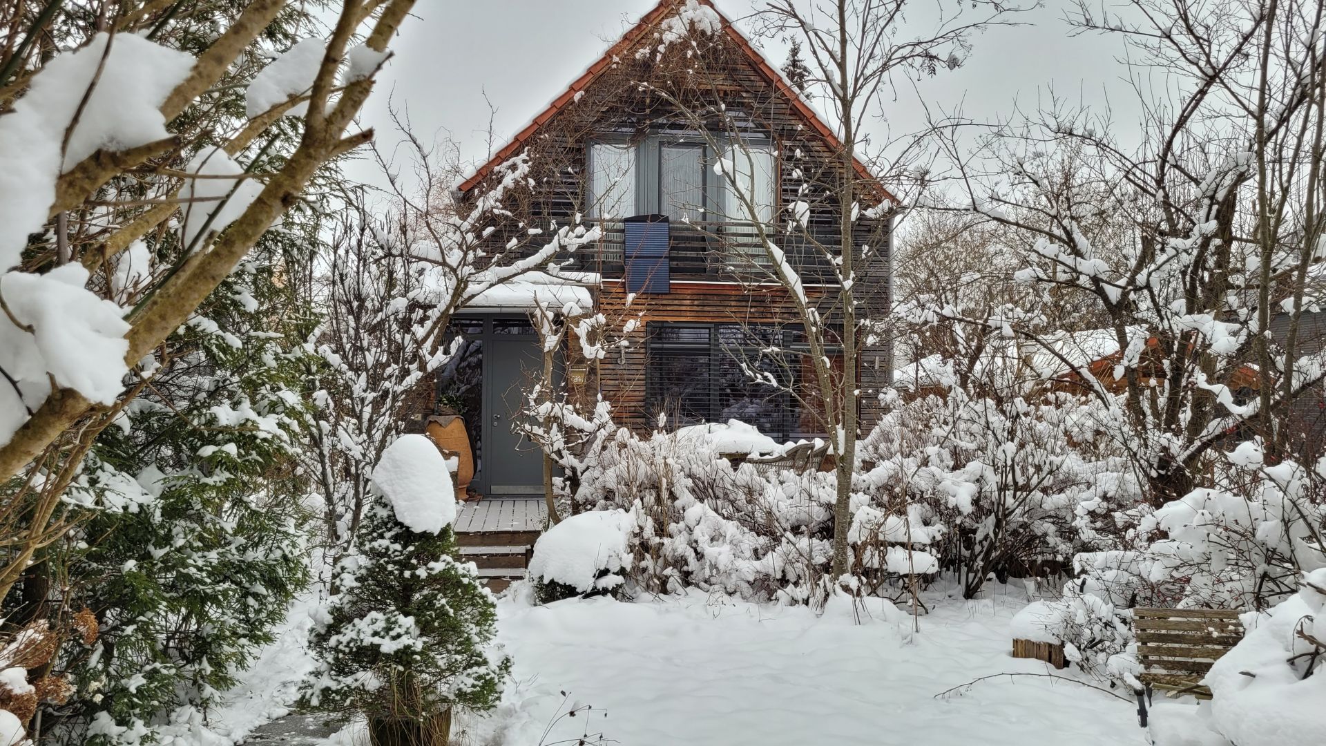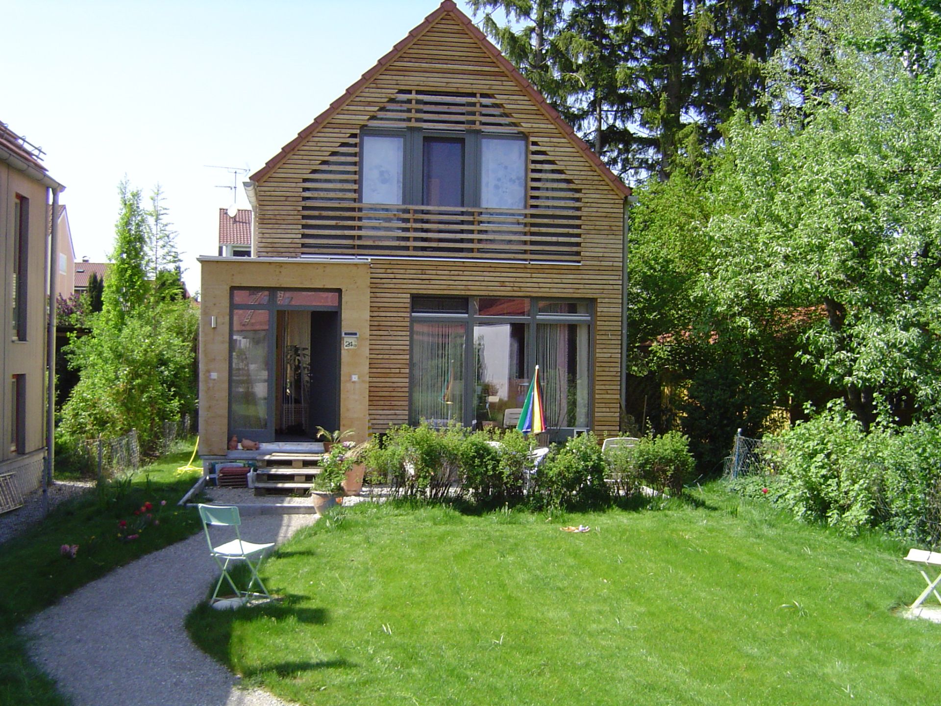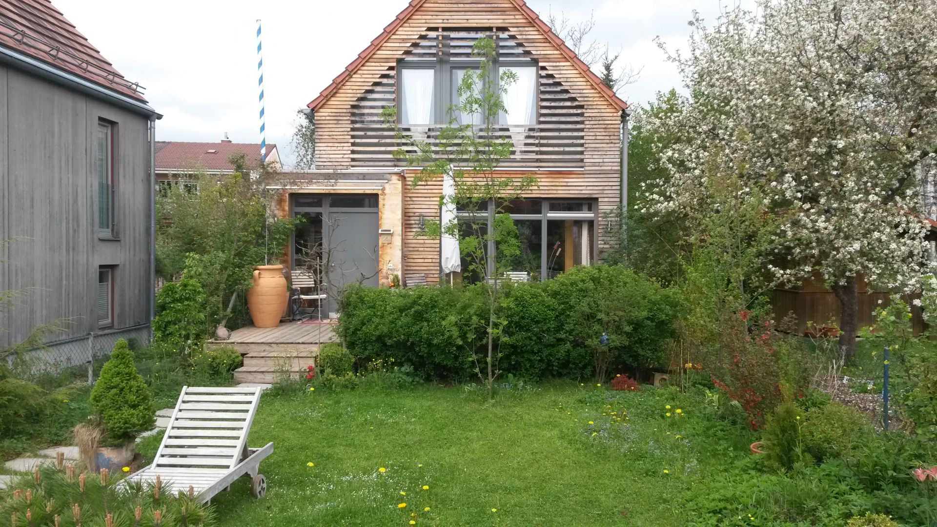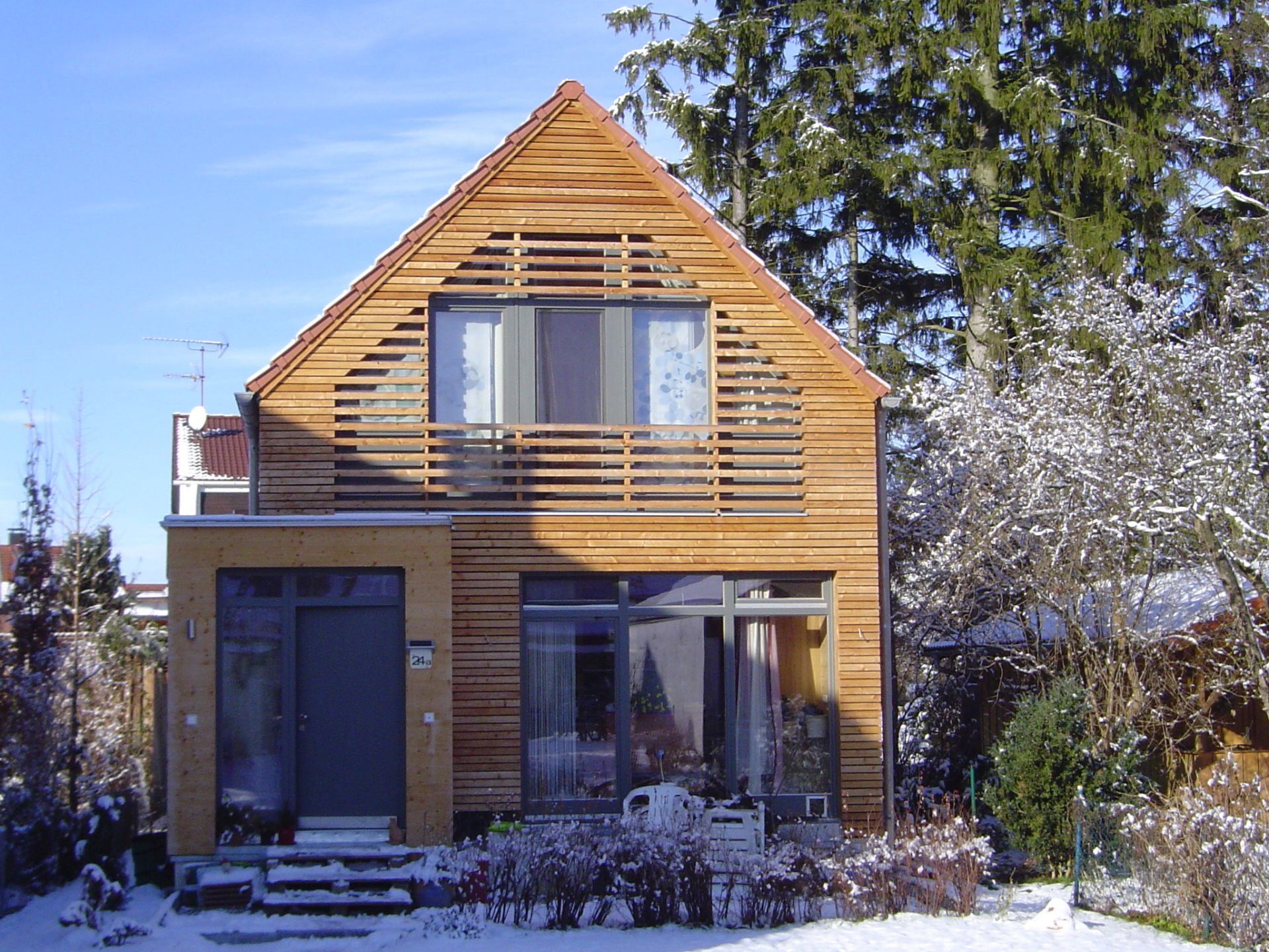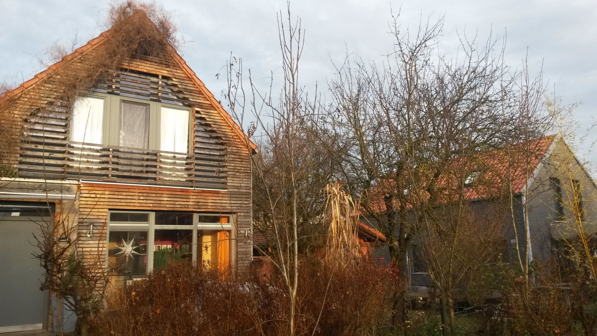 Noch glänzt das Holz unserer Fassade hell im einträchtigen Leuchten des blauen Himmels, der grünen Bäume und des leichten Schnees in unserem ersten Weilheimer Winter.