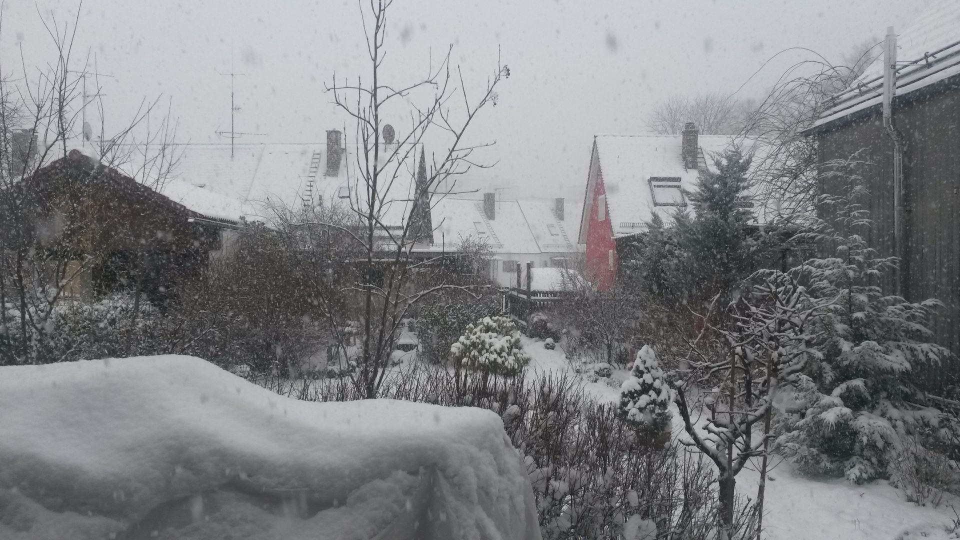 Weilheim kann auch richtig Winter. Zum Glück nur vereinzelt. Der zugedeckte Garten, vom Haus aus gesehen.