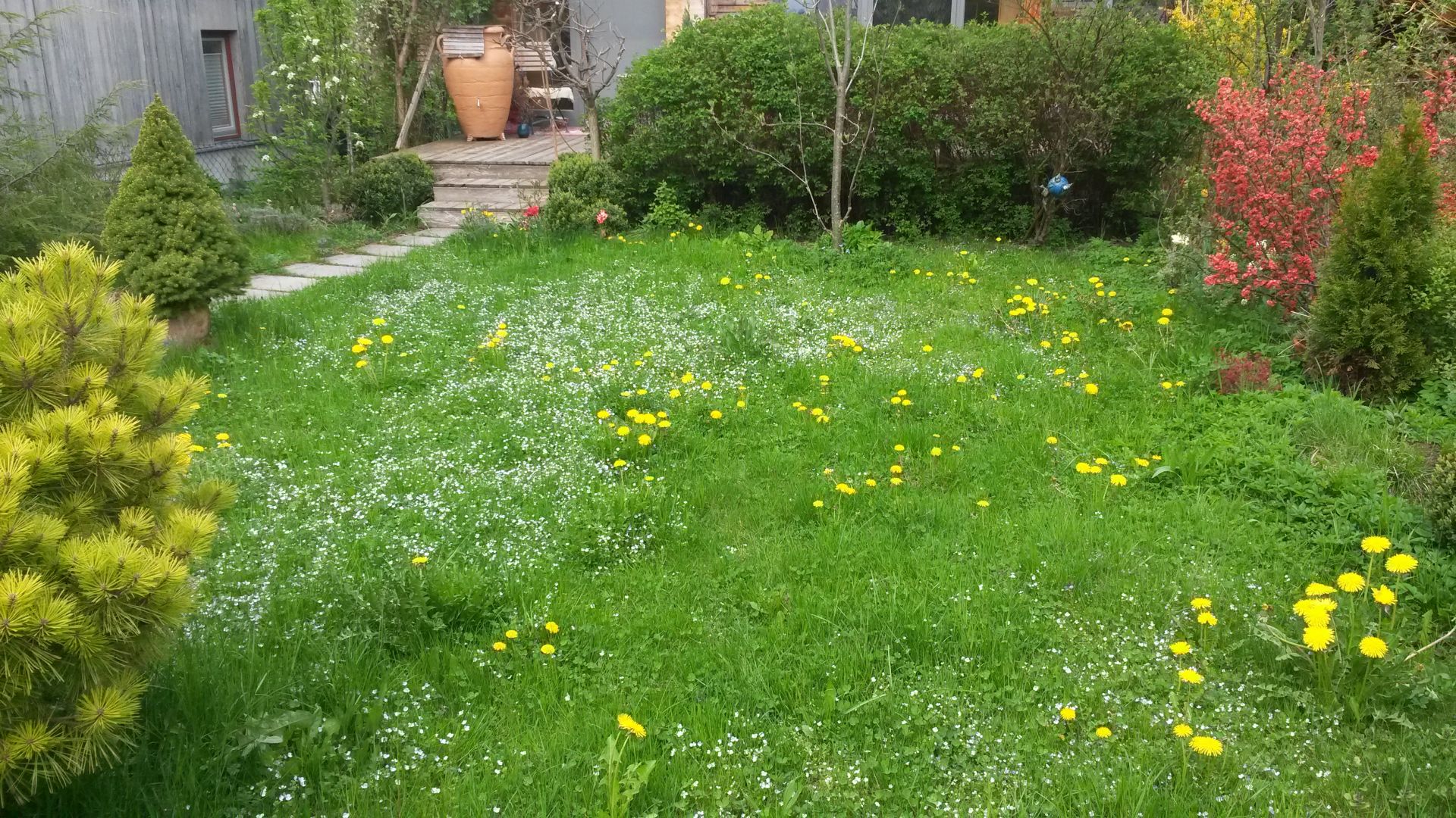 Drei Monate später. Die alljährliche Löwenzahnblüte verwandelt unseren Rasen in ein frisches, buntes Frühlingswunder.