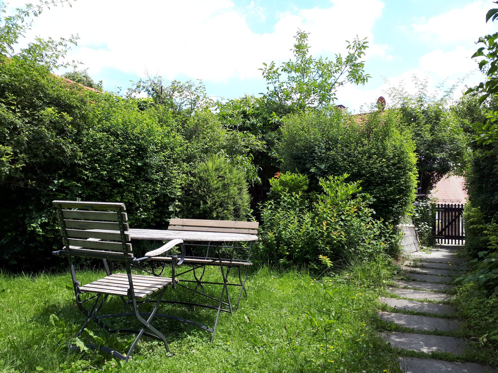 So langsam wird es spürbar üppiger im Garten. Gartenmöbel haben sich ebenfalls dazugesellt - der Zweck ist es ja, gelegentlich in der Sonne zu liegen. Man beachte auch die mal eben eingefügte Eberesche in der Bildmitte...