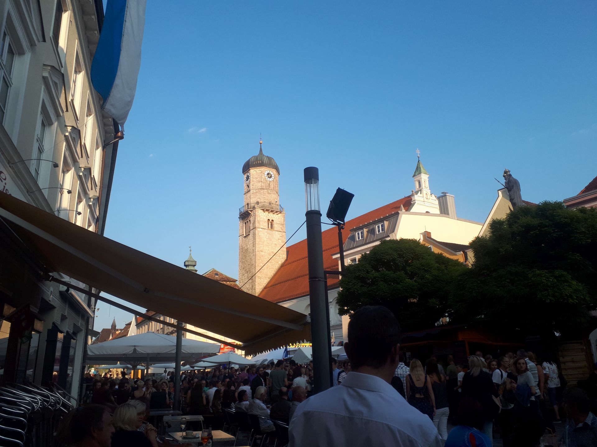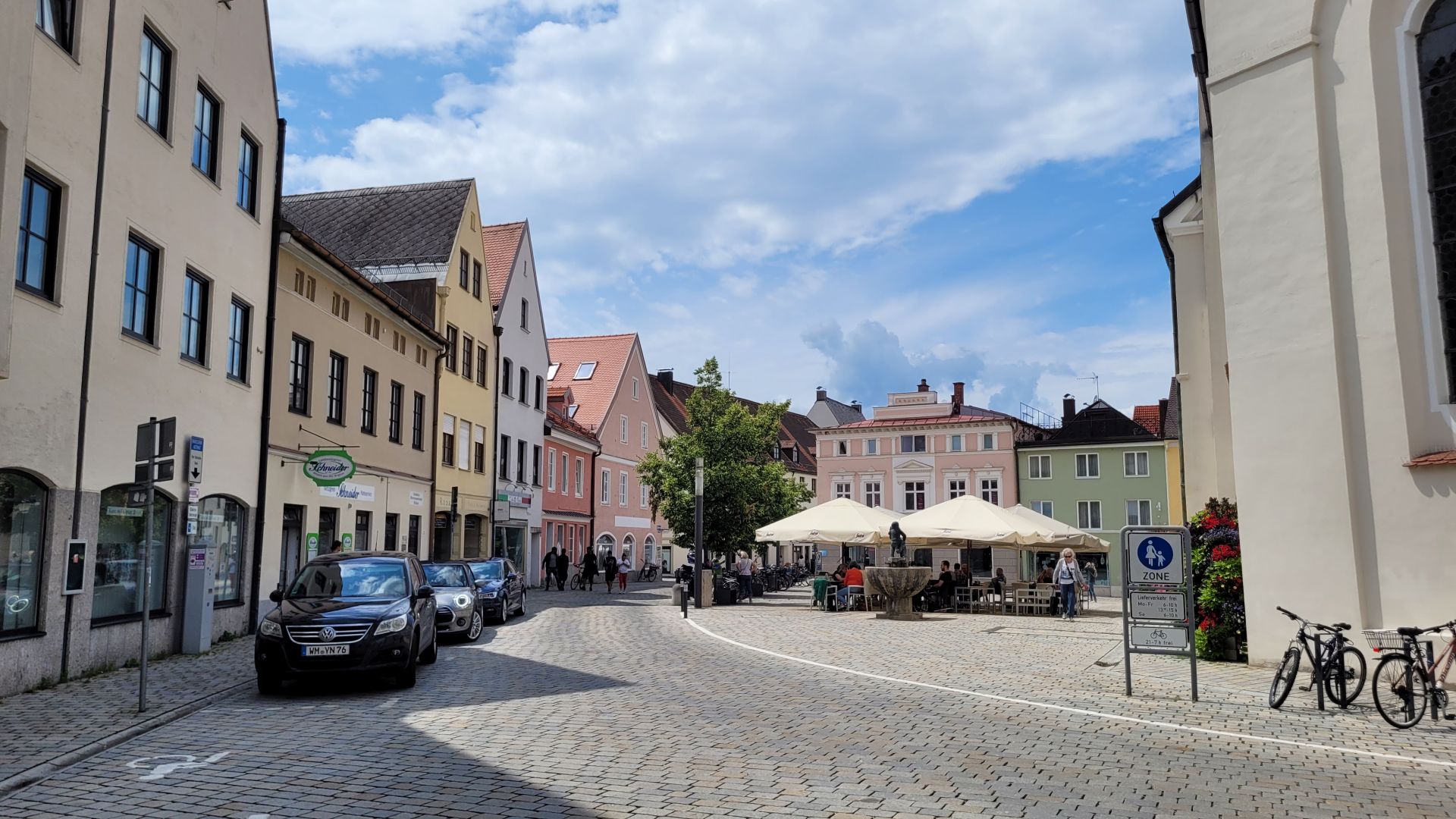 Manche Städte produzieren ja nur Fassade: Der Hauptplatz sieht toll aus und dahinter wird es mau. In Weilheim hat man viel größer gedacht: Blick auf den Kirchplatz, der "hinter" dem Marienplatz die andere Seite der Stadtpfarrkirche einnimmt. Dort sieht es genauso aus: Dieselbe hübsch hergerichtete Fußgängerzone (rechts), derselbe Gastronomie- und Einzelhandelsbetrieb - dieselbe Lebendigkeit.