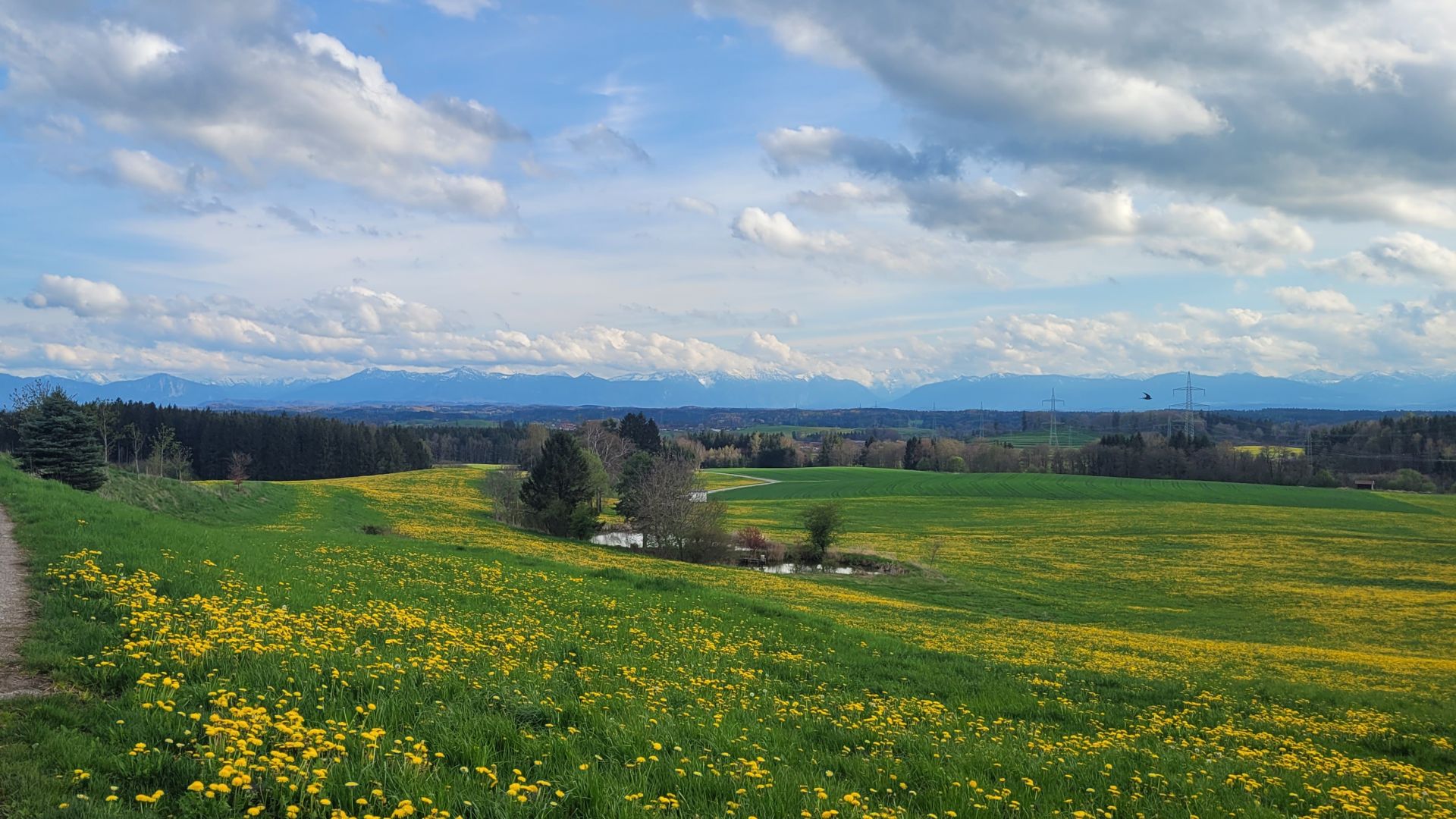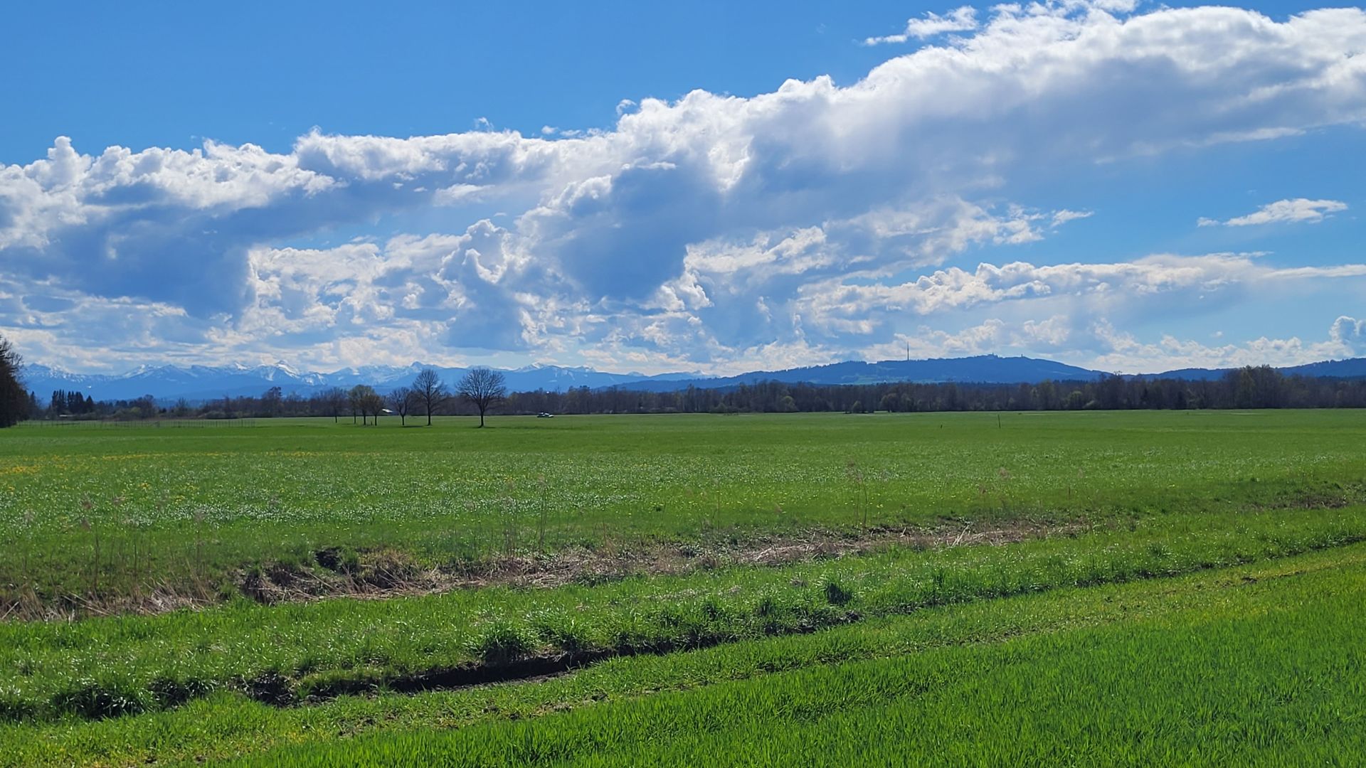 21.April 2023: Die Alpenkette des Oberlandes, rechts der Hohe Peißenberg. Wenn wir unser Haus verlassen und fünf Minuten nach Süden laufen, dann sehen wir genau das vor uns.