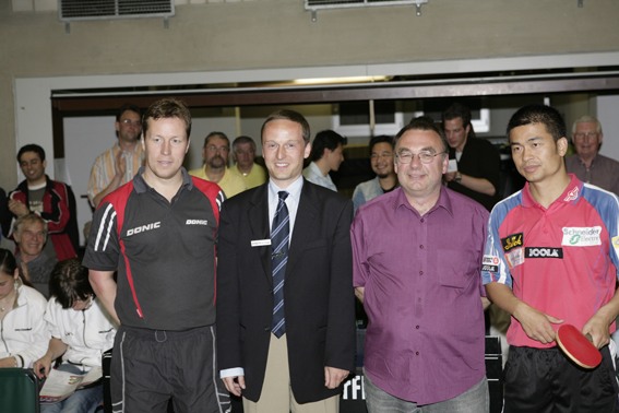 Das Schiri-Leben muss nicht immer ernst sein: Ein Showmatch zwischen der schwedischen Tischtennis-Legende Jan-Ove Waldner und dem österreichischen Champion Chen Weixing in München-Thalkirchen war auch mal eine schöne Abwechslung.